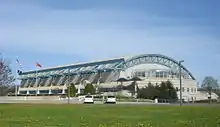 The Nassau County Aquatics Center is an aquatic facility located at Eisenhower Park in East Meadow, NY. It is considered the largest Olympic-sized single-tank pool in North America.[2] At least 16 world records in swimming have been set in the facility.[2] It was built in 1998 for the Goodwill Games. Since the Goodwill Games in 1998, it has hosted numerous swimming championships and high level competitions including the USA Swimming National Championship, NCAA National Championship, Big East Conference Championship and FINA World Cup. The center is 80,000 square feet with a 68m pool and three moveable bulkheads to accommodate SCM, SCY, and LCM competition.[3] In 2002, Natalie Coughlin set multiple world records during the FINA World Cup at the center.[1] In 2002 it was reported that the pool had lost millions of dollars.[1] Dave Ferris was aquatics director in 2002, he reportedly questioned the reported losses, stating that "I don't believe expenses on the building are completely clear at this time".[1] In 2011, the facility underwent a renovation after a 40lbs light fixture fell about 55 feet into the swimming pool.[4] Since 2011 it had also been proposed to build an additional outdoor 50m pool adjacent to the existing facility.[4]