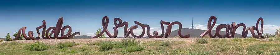 On a hill within and overlooking the arboretum is "wide brown land", spelling out the description of Australia by Dorothea McKellar in her poem My Country, taken from the original manuscript in McKellar's handwriting. It is approximately 35m in length and 3m tall.