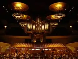 The Auditorio's main concert hall is the Sala Sinfónica (Symphonic Hall) which seats 2,324. The seats in the Main Hall are situated around the concert stage, following the tradition of the modern European concert halls, in the "vineyard configuration”. The hall also houses a large pipe organ.[4][5]