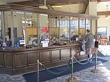 The Bank of Alaska location in Skagway, shown as a branch office of Wells Fargo in 2017. The lobby and teller windows retain decor commonly found in bank lobbies during the early 20th century.