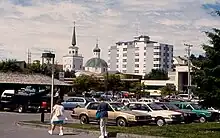An NBA branch is seen at left foreground in this 1997 photo of downtown Sitka. St. Michael's Cathedral and the Cathedral Apartments are in the background.