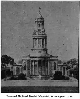 - ↑ "Meeting to be Held at New Church Site". Evening Star. No. 27, 779. Washington, D.C. 15 May 1920. p. 10 – via Chronicling America: Historic American Newspapers. Library of Congress.; "Baptist Memorial Site is Dedicated". Evening Star. No. 27, 780. Washington, D.C. 16 May 1920. p. 5 – via Chronicling America: Historic American Newspapers. Library of Congress.; Annual of the Southern Baptist Convention, 1920. Nashville, Tenn.: Marshall & Bruce Co. 1920. pp. 74, 109.