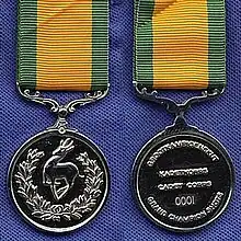 The National Cadet Bisley Grand Champion Medal is a military medal which was instituted by the Republic of South Africa in 1987. Originally named the Cadet Corps Grand Champion Shot Medal, it was awarded to the Grand Champion of the annual National Cadet Bisley of the School Cadet Corps.[1]