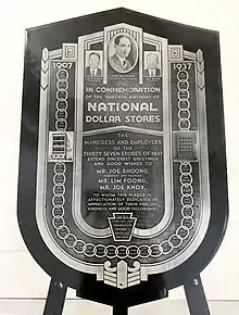 National Dollar Stores, Ltd. (Chinese: 中興公司, often romanized as Chung Hing), formerly known as China Toggery and Sang Lee Dry Goods, was a Chinese American-owned dry goods store chain that operated primarily in the western United States from 1903 to 1996.[1][2] Founded by Joe Shoong (a Chinese-American businessperson and philanthropist) in 1903 and incorporated in 1921, the National Dollar Stores were the first retail chain on the West Coast and one of the largest Chinese American-owned retail chains in U.S. history.[3][1][4]