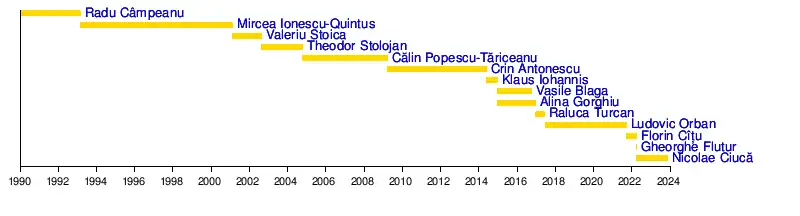 Nevertheless, after a change of leadership that saw Ionescu-Quintus as the new party leader elected in 1995, the PNL contested the 1996 general election once again as part of the CDR.[43] The 1996 general elections represented the first peaceful transition of power in post-1989 Romania, with the PNL, PNȚCD, Democratic Party (PD), and the Democratic Alliance of Hungarians in Romania (UDMR/RMDSZ) forming a grand coalition that pushed the PDSR (formerly the FSN and FDSN) in opposition for the period 1996–2000. Furthermore, the presidency was also won by the CDR's common candidate, more specifically Emil Constantinescu, who received endorsement on behalf of all of the alliance's constituent parties (including the PNL political groups therein).