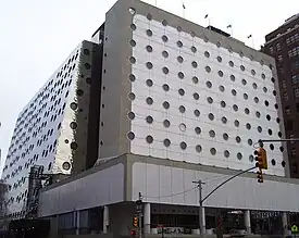 In 1958 the union decided on an aggressive building program, and hired New Orleans-based architect Albert C. Ledner to design some unique buildings for them, including a headquarters building at Seventh Avenue between 12th Street and 13th Street, completed in 1964, a block-through service annex at 346 West 17th Street and a plaza and "pizza-box"-shaped companion building next to it on Ninth Avenue, both built in 1966 and both named for Joseph Curran.[12] The Curran buildings held offices for the union and its pension fund, medical and training facilities, dormitory rooms for seaman, a gymnasium, swimming pool and 900-seat auditorium.[14][15]