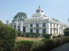 The National Museum of Nepal is in the city of Kathmandu at a short distance from the stupa. The classical building of the museum is on the Western side of the river Vishnu against a hilly background.[2] Entering the museum, on the left is the Art Gallery displaying statues, wood carvings and paintings. The building straight ahead is the Buddhist Art Gallery displaying Buddhist art objects while the building on the right is the Museum of Natural History.