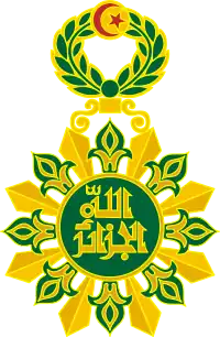 The National Order of Merit (French: Ordre du Mérite National) is an order of merit awarded for all manner of services to Algeria. It was instituted 2 January 1984 and is quite complex, with three classes of 'Dignity' - each with collar, sash with badge and star - as well as Commander, Officer and Knight grades.[1][2]