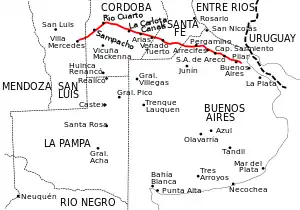 National Route 8 did not exist in the original numbering plan of national routes of 3 September 1935.[1] This route was formed in 1943 with part of the trace of National Route 9 from Buenos Aires to Pergamino, National Route 186, from this city to Río Cuarto, and National Route 160, from this Cordoban city to Villa Mercedes.[2]