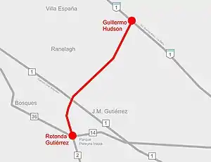 The highway runs (northeast to southwest) through the towns of Guillermo Enrique Hudson and Juan María Gutiérrez and was built over the old Gutiérrez–Hudson and Valentín Vergara avenues. The latter one was the border of the partidos of Berazategui and Florencio Varela.[1]
