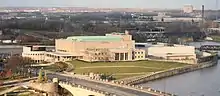 The site along the west side of the Scioto River near the Discovery Bridge on Broad Street was originally home to the Franklin County Veterans Memorial,[3] which originally opened in 1955[4] and was demolished to make way for the museum in early 2015,[5] by S.G. Loewendick & Sons.[6] The construction of a veterans museum was envisioned by city boosters and received support from former Senator and World War II veteran John Glenn.[7]