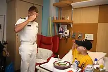 Navy officer shows a young patient at Nationwide Children's Hospital how to salute after presenting him with a Navy ball cap.