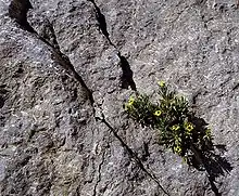 The Afro-alpine zone starts at about 3,500 metres (11,500 ft). It is characterised by cold temperatures, thin dry air, and large daily temperature fluctuations. Plants are subject to solifluction, where needle ice is produced every night in wetter soils.[13] This ice uproots seedlings and can damage roots. Some plants have evolved to live without roots, such as lichens and moss-balls. Giant lobelias Lobelia deckenii have small reservoirs of water between their leaves where water can freeze every night without damaging the plants.[14] When these plants are subjected to temperatures above 15 °C (59 °F), photosynthesis is considerably reduced.[13]
