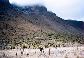 The two giant groundsel species, Dendrosenecio keniodendron and Dendrosenecio keniensis are separated by altitude and topography. D. keniodendron occurs more frequently with increasing elevation above 3,900 metres (12,800 ft) and up to 4,500 metres (14,800 ft),[16] whereas D. keniensis occurs mainly below 4,000 metres (13,100 ft) and very rarely above 4,200 metres (13,800 ft). At intermediate elevations, D. brassica occurs mainly on the wetter valley bottoms, and D. keniodendron mostly on the drier slopes. Where the two species come in close proximity, hybrids are not uncommon.[15]