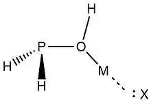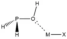 Zheng et al., also analyzed MX interactions with trans- and cis-phosphinuous acid to compare the electron donating abilities of phosphorus and oxygen atoms. The results above demonstrate that when phosphorus acts as the electron donor the weights of ωI and ωII are similar.[9] This is indicative of 3-center 4-electron bonding models. Despite greater mixing, ωII is determined to be the best natural Lewis structure for both the trans- and cis- complexes, with CuBr and AgBr as the only exceptions. Researchers explain that this result is consistent with analyses showing the preference for phosphorus to form covalent interactions. Overall, "the degree of covalency for P–M bonds decreases in the order of F> Cl > Br, Au > Cu > Ag, while the degree of noncovalent for O–M bonds, there is an increase according to F < Cl < Br, Au < Cu < Ag in the entire family."[9]