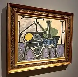 Nature morte au poron is an oil-on-canvas still-life painting measuring 50.3 x 61 cm. It is one of three paintings that Picasso produced the day after Christmas day in 1948.[3] It depicts a table, upon which has been placed a porrón (a traditional Spanish drinking vessel), a lemon and a lobster.[2] The painting was created in a cubist style, with flat angular planes and bright colours. The hexagonal tiles on the floor depicted in the painting have been identified as those in Picasso's studio on the Rue des Grands-Augustins in Paris's Saint-Germain-des-Prés quarter.[1] Picasso was greatly influenced by the work of Paul Cézanne, which is evident in the way that the table is tilted towards the viewer in this painting.[4]