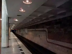 It has a column-type station, shallow, with two lobbies. The bunk, and second floor balconies are supported by columns. Balconies and columns are faced with white marble. The walls around the train tracks are brown.