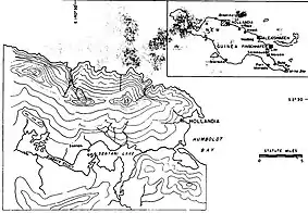 The Battle of Hollandia started on April 22, 1944, as part of the New Guinea campaign. [3] United States Armed Forces as part of Operation Persecution landed at both Humboldt Bay and Tanahmerah Bay, 12 miles west of Humboldt Bay. Both bays are in a rain Tropical rainforest climate. On May 9, the Seabee 113th Construction Battalion arrived at Humboldt Bay and start construction on the port and docking facilities. Buildings and roads were built at the port base camp. A power station, water purification, Seabee camp and depot were built. To receive all the needed supplies for the new Naval Base a pier for Merchant Navy ships was built and completed on June 9. To prepare for the staging of troops, a second pier was built, starting September 13 and completed on November 23. A destroyer repair base was completed on September 1. Seabee 102rd Construction Battalion arrived at Humboldt Bay on June 12, 1944, to speed up construction projects. To expand the base a major land fill project was done into the bay. Beach landing ramps were built to support the loading and unloading of LST ships. Before the piers were completed the Seabee installed pontoon barge docks. Seabees were sent 25 miles west to Tanahmerah Bay on June 19.[4] At Tanahmerah Bay a large fuel oil and diesel tank farm was built. From Tanahmerah Bay some Seabees were sent 8 miles inland to Lake Sentani and built an advance naval headquarters. Seabee 119th and 122nd Construction Battalion arrived to help with work at Tanahmerah Bay. The 122nd Battalion worked at facilities the Wakde Airfield on an Island west of Humboldt Bay and at Aitape east of Humboldt Bay. Naval Base Hollandia supplied most of the supplies for the invasion of the Philippines. Some of the base was moved to more forward bases by the Naval Construction Maintenance Unit 558. The Naval Base Hollandia was closed in December 1945 and the facilities were sold to the Netherlands East Indies Government. .[5] [1][6]