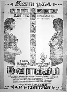 Navarathri (transl. Nine nights) is a 1964 Indian Tamil-language drama film written, produced and directed by A. P. Nagarajan. The film stars Sivaji Ganesan and Savithri. It was the 100th film of Ganesan and is well known for his nine distinct roles.[1] It was remade in Telugu in 1966 as Navaratri and in Hindi in 1974 as Naya Din Nai Raat. The film become a superhit at the box-office, with theatrical run of 100 days.[2][3]