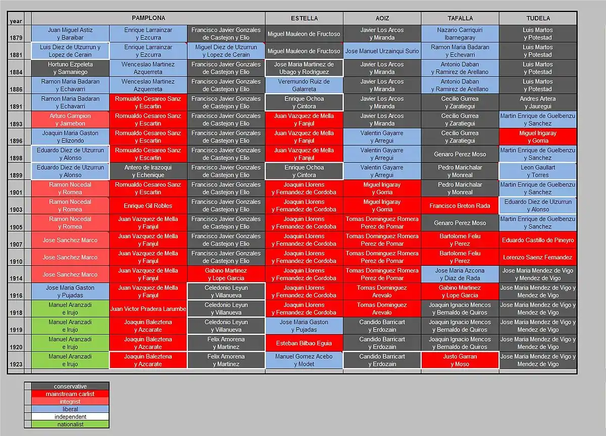 - ↑ in 1907 and 1910; in the partially Riberan district of Tafalla Carlists won 4 out of 6 mandates
