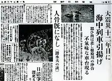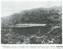 During the Great Kantō earthquake, at two minutes before noon on September 1, 1923, the local train of the Atami-Odawara Line was travelling south towards Manazuru and was stopped at Nebukawa Station. The earthquake caused a mudslide, which covered the station, sweeping the station building, platforms, and train into the ocean, 45 meters down the slope on which the station was built. The Type 960 locomotive and the first 7 cars in the train were submerged, with only the 8th car remaining above water. The train disaster killed 112 people, with an additional 200 people living in the close vicinity of the station also killed by the landslide.[3][4][5] The wreck of the train and tracks were salvaged in September 1932 for scrap metal. The Tokyo-bound train on the same line was stopped in the middle of the bridge over the Nebukawa River just before the station, and was overwhelmed by a 35-foot tsunami, which swept the locomotive into the sea, killing six people.[6]
