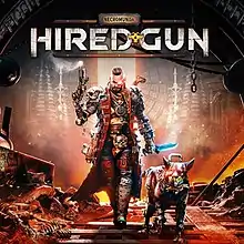 Necromunda: Hired Gun is a first-person shooter, where the player plays as a mercenary who is seeking to uncover a conspiracy involving a powerful gang in Necromunda's underworld. The game is linear, with stages that can be played through normally, later the player can take on contracts that require them to complete specific tasks in portions of the level. The player can choose between melee or ranged weapons, with upgrades available for each. The player can execute an enemy using a melee finisher if they're within a certain range. The game focuses on maintaining momentum, with the player able to use a grappling hook, dash around enemies and wall run. Hired Gun has platforming sections scattered throughout the game that require the use of these abilities. The game features stealth mechanics where the player can sneak past enemies to avoid detection. The player has a combat dog, which can be used to spot and attack enemies, and can be upgraded to improve its abilities and to gain new ones. The end of each level culminates in a boss fight.