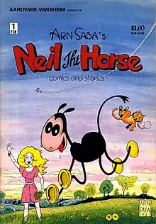 Neil the Horse appeared as a comics feature in the 1980 and 1981 editions of the Canadian Children's Annual,[4][5] and Potlatch Presents the 1980 Comics Annual,[6][7] published by Potlatch Publications of Hamilton, Ontario. Neil the Horse's first comic book appearance was in a colorized version of a 1978 comic strip featured in the first issue of Charlton Comics's Charlton Bullseye, which also announced "next issue: Neil the Horse by Arn Saba!"[8] The second issue of Charlton Bullseye featured an eight page colour story titled simply "Neil the Horse", in which Neil, Soapy, and Poupée take a trip to another universe.[9] Much of this work was seen by Dave Sim and Deni Loubert of the Kitchener, Ontario-based publisher Aardvark-Vanaheim, which led to their offering to publish Neil, first as a backup to Sim's Cerebus and then as a periodical comic book.