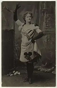 In 1889 she appeared in the pantomime Little Jack and the Big Beanstalk at the Prince of Wales Theatre in Liverpool.[3] In 1893 she introduced her new ‘Floral Electric Dance’ which she first performed at the Alhambra Theatre in Leicester Square in London with "kaleidoscopic effects" by Mr. A.L. Fyfe and specially written music by Georges Jacobi,[4][5][6]