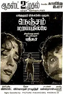 Nenjam Marappathillai (transl.The Heart Never Forgets) is a 1963 Indian Tamil-language paranormal romance film written and directed by Sridhar. The film stars Kalyan Kumar and Devika, with M. N. Nambiar, S. V. Sahasranamam, Nagesh, Padmini Priyadarshini and Manorama in supporting roles. It focuses on a college boy who, while exploring a dilapidated villa, learns all the details about his past life.