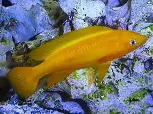 Neolamprologus leleupi (lemon cichlid) is a species of cichlid endemic to Lake Tanganyika where it occurs throughout the lake. It is a recess-dweller, inhabiting cracks and crevices. It feeds on invertebrates living in the rich biocover of the substrate. This species reaches a length of 10 centimetres (3.9 in) TL.[2] The color of this fish ranges from bright yellow to deep brown. Both color variations exist at each location where this species is found. This relatively small cichlid is a substrate spawner (cave spawner). It is easily confused with the very similar N. longior (Staeck, 1980) a fish also endemic to Lake Tanganyika. The specific name honours the Belgian entomologist Narcisse Leleup (1912-2001), who collected the type.[3]