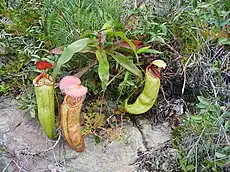 In open areas, N. bokorensis is sometimes sympatric with other carnivorous plants, including sundews and bladderworts.[11] The N. bokorensis plants found by François Mey in 2007 grew alongside a crimson form of Drosera peltata, but this population was destroyed by the time of the author's return in 2009.[12] Drosera peltata still grows sympatrically with N. bokorensis at "Location C", a massive clearing discovered in 2011 on the Bokor plateau.[11] The D. peltata plants at this site range in colour from yellowish-green to red and frequently exceed 30 cm in height.[11] Nepenthes bokorensis also shares this habitat with another sundew—D. burmannii—as well as with various grasses, stunded shrubs, and lithophytic orchids.[11] Local bladderwort species include U. bifida, U. odorata, U. minutissima, U. striatula, U. subulata, and U. uliginosa.[13][14][15][16]