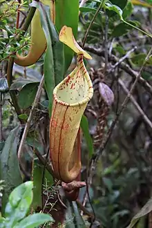 | An upper pitcher of N. densiflora from Mount Kemiri, Gunung Leuser National Park. This form of the species is unusual in producing partly cylindrical upper pitchers. | |