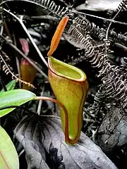 In his description of the Bornean species N. campanulata, botanist Shigeo Kurata suggested that it may be closely related to N. inermis.[19] However, other taxonomists disagree with this hypothesis.[20] While these two species are similar in general stature and pitcher morphology, they are not only separated by great geographical distance, but also occur in completely different habitats; N. campanulata is a lowland species endemic to limestone substrates,[21] whereas N. inermis usually grows as an epiphyte at elevations of 1,500–2,600 metres (4,900–8,500 ft).[7][22]