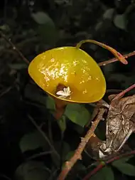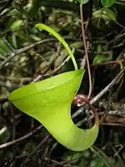 The unusual upper pitchers of N. inermis are larger than its lower pitchers, growing to 9 centimetres (3.5 in) in height and 5 centimetres (2 in) in width.[2] They gradually or abruptly arise from the ends of the tendrils, forming a 1–2 centimetres (0.4–0.8 in) wide curve.[2] They are tubular to infundibular in the lower two-thirds with laterally appressed pitcher walls. As in N. dubia, there is almost no gap between the walls in mature pitchers. The upper part of the pitcher is widely infundibular throughout. Wings are reduced to ribs in upper pitchers. The mouth is round and either horizontal or slightly raised at the front and rear. The inner surface of the pitcher is often said to be glandular throughout with no waxy zone,[9][10] but one source states that the waxy zone is merely reduced.[11] Mature upper pitchers are generally considered to completely lack a peristome, a trait that is unique to this species,[7][10] although one source gives a peristome width of 0.7 millimetres (0.03 in) for an 8 centimetres (3 in) tall upper pitcher (the inner portion of the peristome is said to account for 20% of its total cross-sectional surface length, the lowest proportion among studied species).[11] The lid is very long, narrow, and cuneiform. It is never reflexed beyond 90 degrees relative to the mouth.[7]