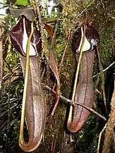 Rosette and lower pitchers are typically ovate in the basal quarter to half of the pitcher cup, becoming cylindrical and sometimes slightly infundibular above. A conspicuous hip often delimits these two parts of the trap. Terrestrial pitchers may be quite large, reaching 30 cm in height by 6 cm in width. A pair of fringed wings (≤6 mm wide) runs down the ventral surface of the trap, bearing filaments up to 12 mm long. The peristome is cylindrical at the front and becomes flattened and broader towards the sides and rear, measuring up to 3 cm in width. It bears ribs up to 2 mm high and spaced up to 2.5 mm apart. These ribs terminate in teeth (≤8 mm long) on the inner margin of the peristome, the largest being located towards the top. There is often a gap of several millimetres separating the two lobes of the peristome directly below the lid. The pitcher lid or operculum is ovate to orbicular and typically has a cordate base as well as a frilled margin. It measures up to 6 cm in length by 4.5 cm in width. A triangular or hook-shaped basal crest (≤1 cm long) is commonly present on the lower surface of the lid. An unbranched spur measuring up to 10 mm in length is inserted near the base of the lid. Lower pitchers typically have a very dark pigmentation, being purplish-black throughout. However, the indumentum covering the traps can give them an orange or brownish sheen. The peristome is generally purple, black, or dark brown, but may have lighter coloured teeth ranging from green, through yellow, to white. The inner surface of the pitcher may be light yellow, white, or light purple, and often bears purple speckles. The pitcher lid is often yellow or green on the underside and dark purple on its upper surface. Occasionally, the pitcher may be yellowish-green throughout with a black peristome.[4]