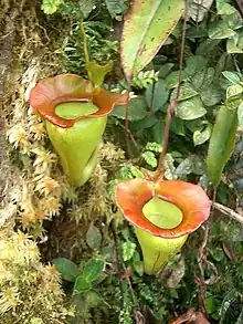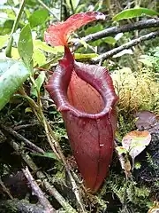 Upper pitchers are much larger, growing up to 15 cm high and 10 cm wide. Wings are reduced to ribs that run down the front of the pitcher. The greatly expanded peristome may reach 3.5 cm in width in aerial pitchers. The lid does not cover the mouth completely, being narrowly ovate. It is up to 5 cm long and 2 cm wide. The crater-like glands on the underside of the lid may be up to 1.5 mm wide. These glands are so large that they are visible as swellings on the upper surface of the lid. The spur is simple and up to 1 cm long. Pitchers range in colour from light green to dark purple throughout and may be lightly speckled. The most common form of this species has green pitchers with a red peristome.[1]