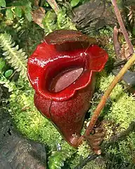 The unusually large glands on the underside of the lid produce copious amounts of nectar and likely lure insects into a precarious position over the pitcher mouth.[1]