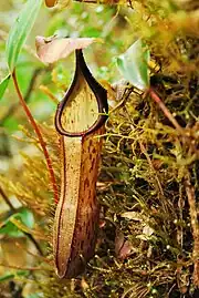 Rosette and lower pitchers are ovate in the basal third to quarter of the pitcher cup, becoming approximately cylindrical above and infundibular towards the pitcher mouth. They are relatively small, growing to only 12 cm in height by 3 cm in width. A pair of wings (≤4 mm wide) typically runs down the ventral surface of the pitcher cup, with fringe elements measuring up to 8 mm in length. These wings may be reduced to ribs in some plants. The glandular region on the inner surface is restricted to the ovate portion of the pitcher cup.[6] The glands are small (0.2–0.3 mm in diameter) and occur at a density of around 150–180 per square centimetre.[2] The waxy zone is well developed[12] and eye spots may occasionally be present on the rear inner surface, visible through the opening.[7] The peristome is sub-cylindrical[6] to cylindrical and up to 4 mm wide. It bears ribs up to 0.1 mm high and spaced 0.2 mm apart, which terminate in teeth up to 0.4 mm long.[7] The inner portion of the peristome accounts for around 51% of its total cross-sectional surface length.[12] The pitcher lid or operculum is ovate and has a cordate base. It measures up to 3 cm in length by 2.5 cm in width and does not bear any appendages. The underside of the lid has an even distribution of small (0.1–0.2 mm in diameter) convex glands, occurring at a density of about 40/cm2.[2] The spur, which is inserted near the base of the lid, is up to 7 mm long and may be simple, forked, or fasciculate[7] with up to 12 branches.[2]