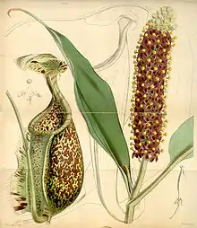 Left: Nepenthes rafflesiana var. insignis, an apparently "large-pitchered variety with unusually dark purple markings",[3] as illustrated in The Gardeners' Chronicle, 1882
