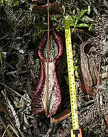 The giant form is a much larger plant than the typical form in all respects. The stem may climb to a height of 15 m. Leaf blades are around two and a half times as long as usual. Lower pitchers reach 35 cm in height by 15 cm in width and sometimes exceed 1 litre in volume, making them some of the largest in the genus.[16] They vary widely in pigmentation, from white with red blotches to dark purple. Upper pitchers may be spotted or green throughout. The inflorescence is also massive, reaching over 1 m in length. The individual flowers measure up to 1.5 cm in diameter and have dark red tepals.[16]