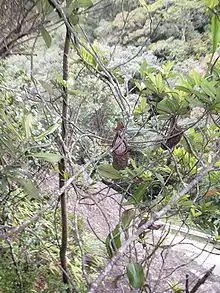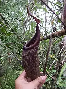 If the type locality is the site of the last remaining population of this species then it is one of rarest Nepenthes known and "threatened with imminent extinction".[4] In Pitcher Plants of the Old World, Stewart McPherson wrote that field studies are "urgently required" to properly assess its conservation status.[4] In 2010, the Rare Nepenthes Collection was established with the aim of conserving N. rigidifolia and three other critically endangered Nepenthes species: N. aristolochioides, N. clipeata, and N. khasiana.[11][12][13]