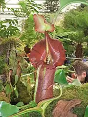 Lower pitchers of N. robcantleyi at the 2011 Chelsea Flower Show. The pitcher in the foreground is fully developed, with mature colouration; a developing, unopened pitcher is visible in the background (top-right).