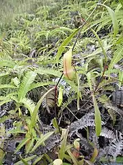 Upper pitchers are typically somewhat infundibular in the lowermost part, becoming narrowly ovoid in the lower third, and finally cylindrical and slightly narrower above. They may be quite large, reaching 25 cm in height by 5 cm in width.[5] The waxy zone of the inner surface is well developed.[8] A pair of remnant ribs is present in place of the ventral wings.[5] The inner portion of the peristome accounts for around 40% of its total cross-sectional surface length.[8] Other parts of aerial pitchers are similar to their lower counterparts.[5]