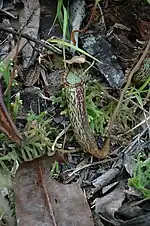 Rosette and lower pitchers are cylindrical throughout and have a small horizontal mouth.[6] Unusually, they lack ventral wings. The lid is broadly triangular and lacks appendages.[3] Pitchers are yellowish with dark speckles and a striped peristome.[2]