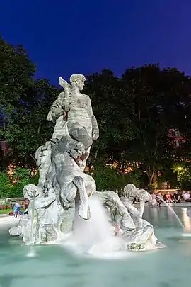 Neptunbrunnen is a fountain located in the Alter Botanischer Garten of Munich, Germany. It was sculpted in 1937 at the behest of the National Socialist government by Josef Wackerle. A muscular statue of neptune stands in the middle of the fountain, holding a trident on his shoulder, above a fish-tailed horse rising from the water.