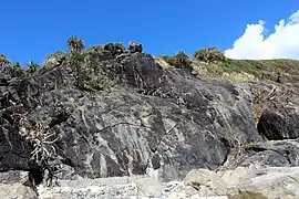 This formation contains a heterogeneous succession of sandstone. Either derived from volcanic action, or locally oolitic. Other constituents include siltstone, chert and minor mafic volcanics including pillow basalt. Conglomerate and jasper, with low metamorphosed greenschist are also present. Basaltic volcanics are interbedded with the Neranleigh-Fernvale sediments. Fossils are rarely encountered.[1][2][3]