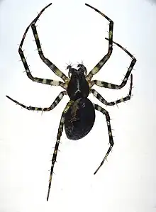 The body length excluding legs is about 4 to 7 mm in both sexes, males having a slimmer abdomen.[1][2] The carapace is dark brown with a darker midline and margins.[1][3] The abdomen is marked with a broad brown folium with pale speckles and small indentations, surrounded by a pale area.[1][3] The legs are yellow-brown with many annulations which, along with its size, help to distinguish N. montana from similar species.[1] It builds a hammock-shaped web among bushes or low vegetation, on tree trunks, or under logs, which it rests beneath.[1]