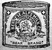 Bear Brand is a drink and powdered milk brand[3] introduced in 1892 in the Philippines by the "Bernese Alps Milk Company",[1] and currently owned by Nestlé.[4][5][6] The brand is available in most areas of Southeast Asia, East Asia, and Eastern Africa, as well as in Asian stores in the United States and Canada. It was marketed under the brand name "Marca Oso", which is Spanish for "Bear Brand".[7] The brand's Indonesian name is "Susu Cap Beruang".