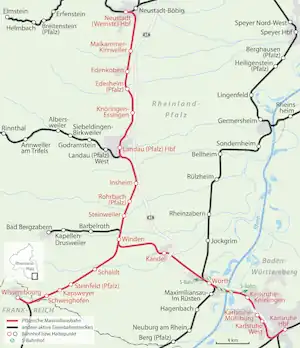 | Line length | Neustadt–Wissembourg: 46.9 km Winden–Karlsruhe: 27.0 km | ||||||||||||||||||||||||||||||||||||||||||||||||||||||||||||||||||||||||||||||||||||||||||||||||||||||||||||||||||||||||||||||||||||||||||||||||||||||||||||||||||||||||||||||||||||||||||||||||||||||||||||||||||||||||||||||||||||||||||||||||||||||||||||||||||||||||||||||||||||||||||||||||||||||||||||||||||||||||||||||||||||||||||||||||||||||||||||||||||||||||||||||||||||||||||||||||||||||||||||||||||||||||||||||||||||||||||||||