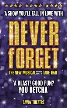 Reception![]() Show poster Reviews for the tour were mostly positive. For instance, the headline for the review in The Guardian declared, "Hell, you've got to love 'em – A million love songs and a happy ending: it's hard not to fall for Take That's own Mamma Mia!"[5] Another Manchester critic's assessment was less enthusiastic: "For a story which could touch upon the post-Factory Manchester music scene, the rise of boy bands and the regeneration of the city after the bomb, Never Forget is surprisingly damp. Writers Guy Jones and Danny Brocklehurst have seemingly taken the money and run on this one, turning in a script which is a bland and childish tale of friendship surviving against the rigours of fame."[6] Reviews for the West End opening were generally favourable, bestowing particular praise on Karen Bruce’s choreography and the falling rain special effect.[7] The Daily Telegraph theatre critic Charles Spencer wrote that it was "not nearly as terrible as I secretly hoped it would be.... [It was] rapturously received [and] clearly destined to do a lucrative trade".[8] However, box office returns quickly fell off, and the production lost money. ControversyIn April 2006, EMI licensed the Take That songs to be used in Never Forget. At the time, Take That had not performed together since the 1990s. Soon thereafter, however, the band re-formed. In 2007, Take That posted the following statement on their website: "The band would like to state categorically that this production is being undertaken with neither their involvement nor their endorsement. They would wish their fans and the general public to know that this production is absolutely and 100 per cent nothing to do with Take That."[9] After the musical's opening in London, Gary Barlow told the BBC, "At first I thought it sounded horrible... [but] the reports I've seen have been really good so there must be something good in it. I'm just worried that they're better than us."[8] Awards and nominations